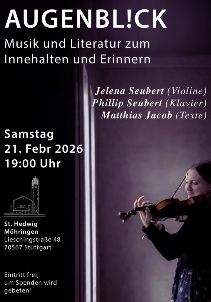 Es musizieren Jelena Seubert (Violine) und Phillip Seubert (Klavier) – dazu trägt Matthias Jacob Texte, Impulse und Meditationen vor.