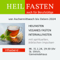 Infoabend für alle Interessierten am 31.01.24 um 19:30 Uhr. Das Abschlusstreffen am Mi. 10.04., 19:30 Uhr muss leider entfallen. Gewinnen Sie durch eingeschränktes Essen mehr Leichtigkeit für Körper und Seele. Sie entscheiden selbst, auf welche Art Sie fasten möchten. Beim Heilfasten wird der Körper durch einfache Schonkost entlastet, um die…